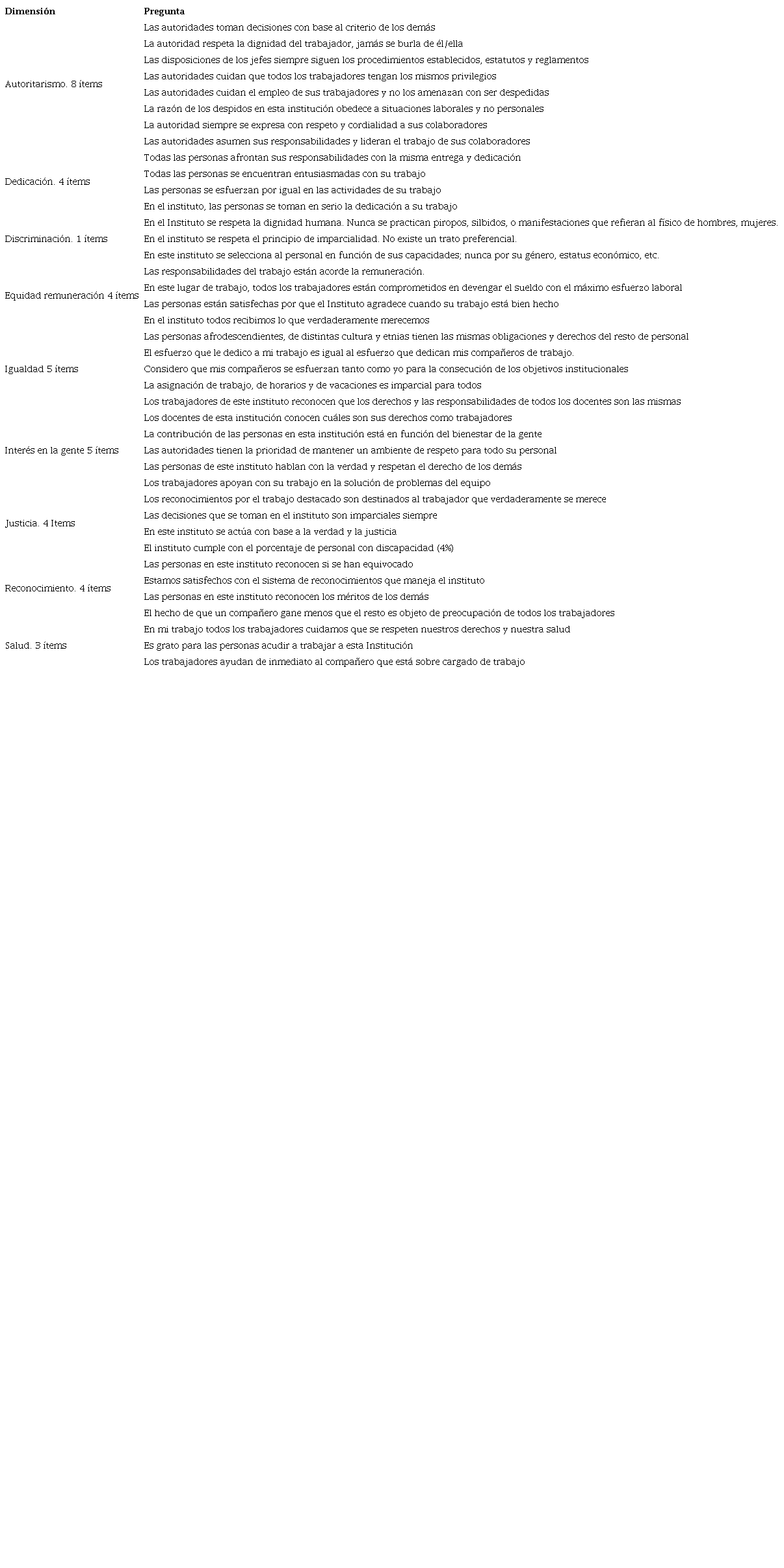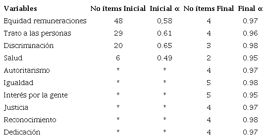 En primera instancia, existían 23 ítems; posteriormente con el criterio de consistencia interna α= 0.71; se eliminan 17 de estas afirmaciones. En el análisis factorial finalmente, esta dimensión desaparece porque los registros factoriales de la misma se organizan con los factores restantes de las otras variables y pasan a consolidar cinco nuevas dimensiones: autoritarismo, igualdad, interés en la gente, justicia, dedicación y reconocimiento.