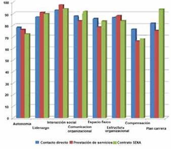 En cuanto a las percepciones del clima organizacional en empleados bajo contrato por prestación de servicios, se encontró que las dimensiones puntuadas ligeramente bajas fueron: “autonomía”, “espacio físico” y “plan carrera”. Así mismo, la dimensión de “compensación” presenta una puntuación baja para contrato SENA y prestación de servicios (por debajo de 70 puntos) y para contrato a término indefinido se encontró que es puntuada ligeramente baja con 77 puntos, lo que implica cierta inconformidad a nivel general respecto al tema de salarios y remuneración económica.
