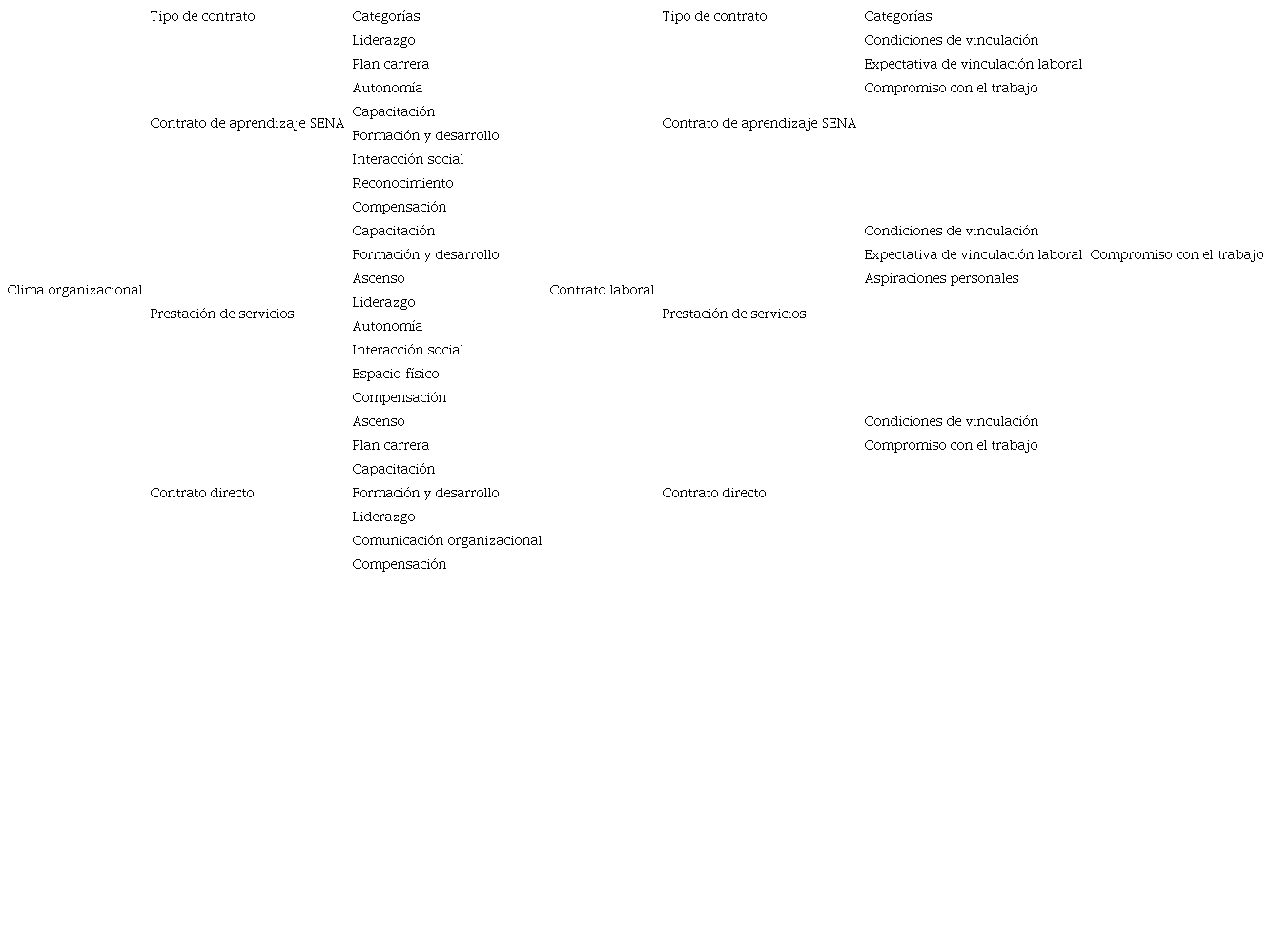 A partir de la realización de las entrevistas a los empleados según el tipo de contrato, se encontraron las siguientes categorías emergentes para comprender las percepciones de clima organizacional en función del tipo de contrato o vinculación laboral (Tabla 2). Los resultados se clasifican en dos componentes: clima organizacional y contrato laboral. Es evidente que aparecen aspectos del contrato laboral como tal en las tres modalidades de contratación, referentes a las condiciones de vinculación, expectativas de vinculación y compromiso con el trabajo. La dimensión de “plan carrera” se encontró ligada a todo lo referente a “capacitación, formación y desarrollo”.