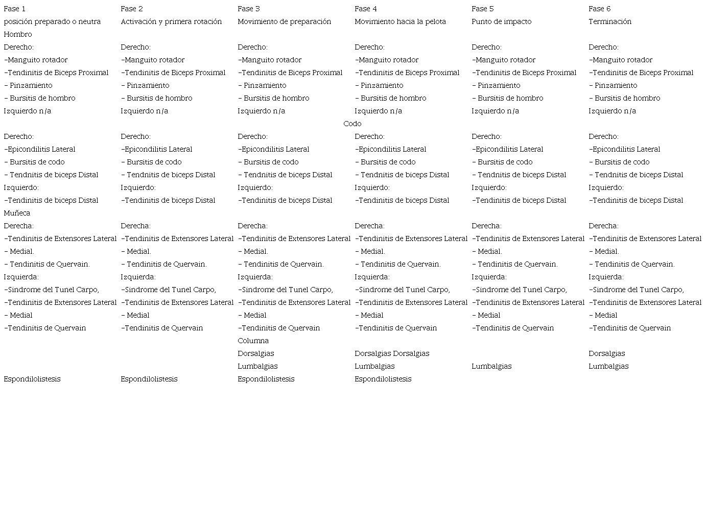 Se identificaron las posibles lesiones que pueden generarse por sobreuso y repetitividad de acuerdo con los movimientos que realizan las articulaciones del hombro, codo y mano riesgo de lesiones depende de la fase en que cada articulación este mayormente involucrada, tal como se muestra en la Tabla 1 que a partir de la fase 3 se involucran movimientos de rotación, inclinaciones y extensión del tronco que pueden generar lesiones a nivel de columna. El riesgo de la aparición de lesión está asociada a las condiciones particulares de los deportistas, ya que existen factores tanto internos como externos que alteran las variables biomecánicas y por lo tanto la probabilidad del riesgo.