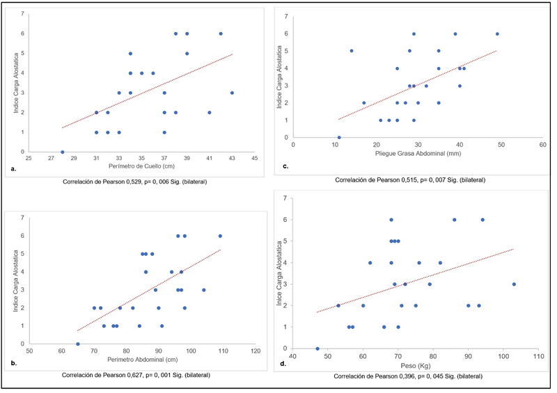 Resultados: Se encontraron correlaciones estadísticamente significativas entre carga alostática y estrés. Además de una asociación significativa entre carga alostática y variables antropométricas, específicamente circunferencia de cuello.
