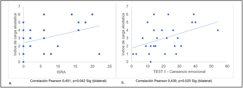 En referencia al estrés se encontraron correlaciones estadísticamente significativas entre la carga alostática y el Inventario de Situaciones y Respuestas de Ansiedad (ISRA) (p= 0.042), al igual que con el inventario de Maslach Burnout (p= 0.029), específicamente en la dimensión de cansancio emocional (p= 0.025), pero no con las dimensiones de realización personal y despersonalización, tampoco se encontró correlación significativa con el Inventario de la Depresión de Beck. (Figura 2).
