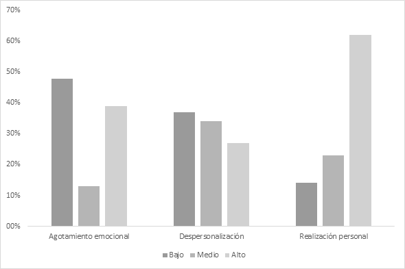 La prevalencia de SB fue del 8.7 % (6/69) en los participantes del estudio, encontrándose mayor frecuencia en mujeres (4/6) y en personal médico (4/6). En cuanto a las escalas del SB; el AE se identificó bajo en el 47.8 % (33/69) de la muestra; los niveles de DP fueron bajos en el 37.7 % (26/69) y la RP fue prevalentemente alta en el 62.3 % (43/69), como se puede observar en la Figura 1.