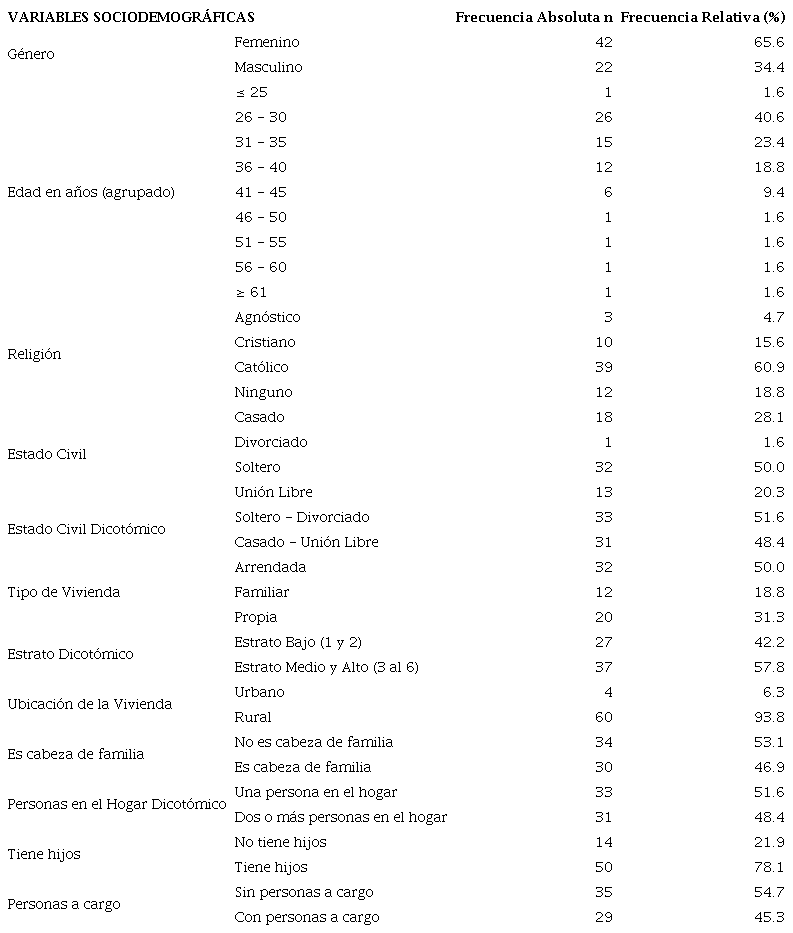 Se tomó para el presente estudio una muestra de 64 médicos graduados que laboran en las áreas de Atención Domiciliaria (n= 35) y Telemedicina (n= 29) y que atendían pacientes con sospecha o diagnóstico confirmado de SarsCoV2; cerca de las tres cuartas partes de la muestra fueron mujeres, más del 80% de la población eran adultos jóvenes menores de 40 años; se distribuye la muestra de manera equitativa entre convivir con una pareja y quienes son solteros; así como el estar a cargo de más personas. Por otro lado, se evidencia que la tendencia equitativa es similar respecto a la distribución del tipo de vivienda que habitan (arrendada vs familiar - propia); sin embargo, se identifica que la gran mayoría (93.8 %) de la muestra viven en el área Urbana de Medellín (Tabla 1).