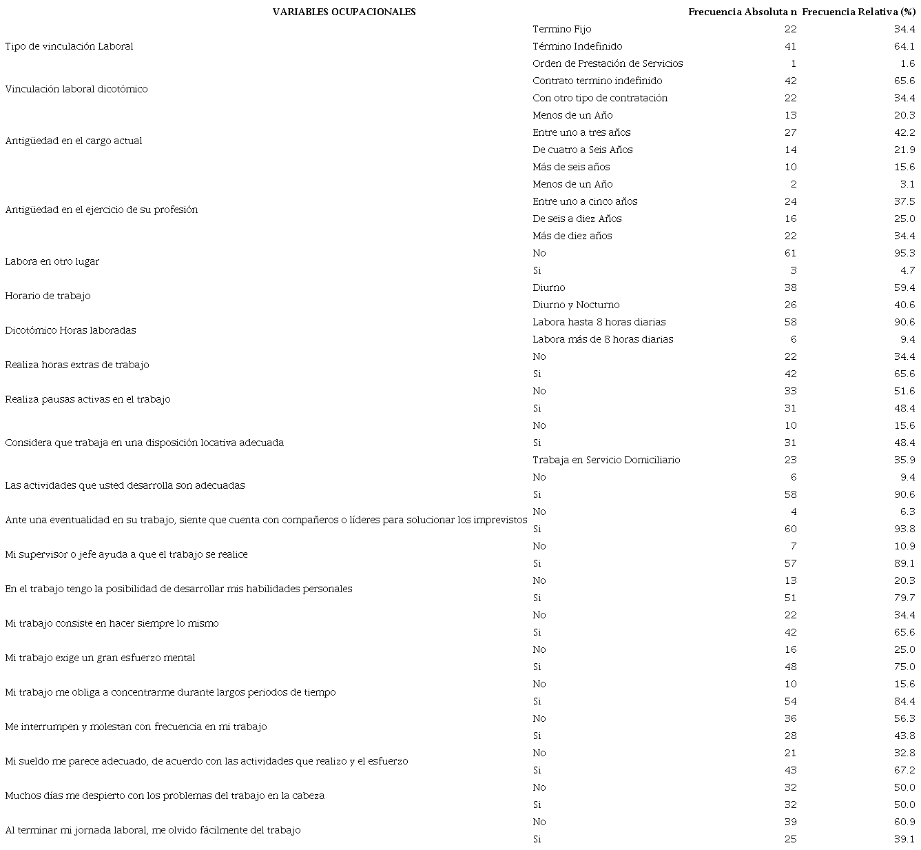 Respecto a la percepción de la disposición locativa el 48.4 % considero que su sitio de trabajo es adecuado y el 35.9 % manifestaron que realizan actividades extramurales (servicio domiciliario); 90.6 % comentaron que las actividades que desarrolla son adecuadas según su nivel de formación; 93.8 % refirieron tener apoyo por parte de sus compañeros de trabajo ante cualquier eventualidad y 89.1 % expresaron sentir apoyo por parte de sus jefes o supervisores; por otro lado, 79.7 % refirieron desarrollar sus habilidades personales en su trabajo; para el 65.6 % su trabajo era monótono, 75.0 % declararon que su trabajo requería esfuerzo mental, un 43.8 % fueron interrumpidos en sus labores ocupacionales; el 60.9 % de la muestra presentó dificultad para olvidarse fácilmente de su trabajo en sus espacios extramurales y 67.2 % manifestaron estar conformes con su remuneración salarial (Tabla 2).