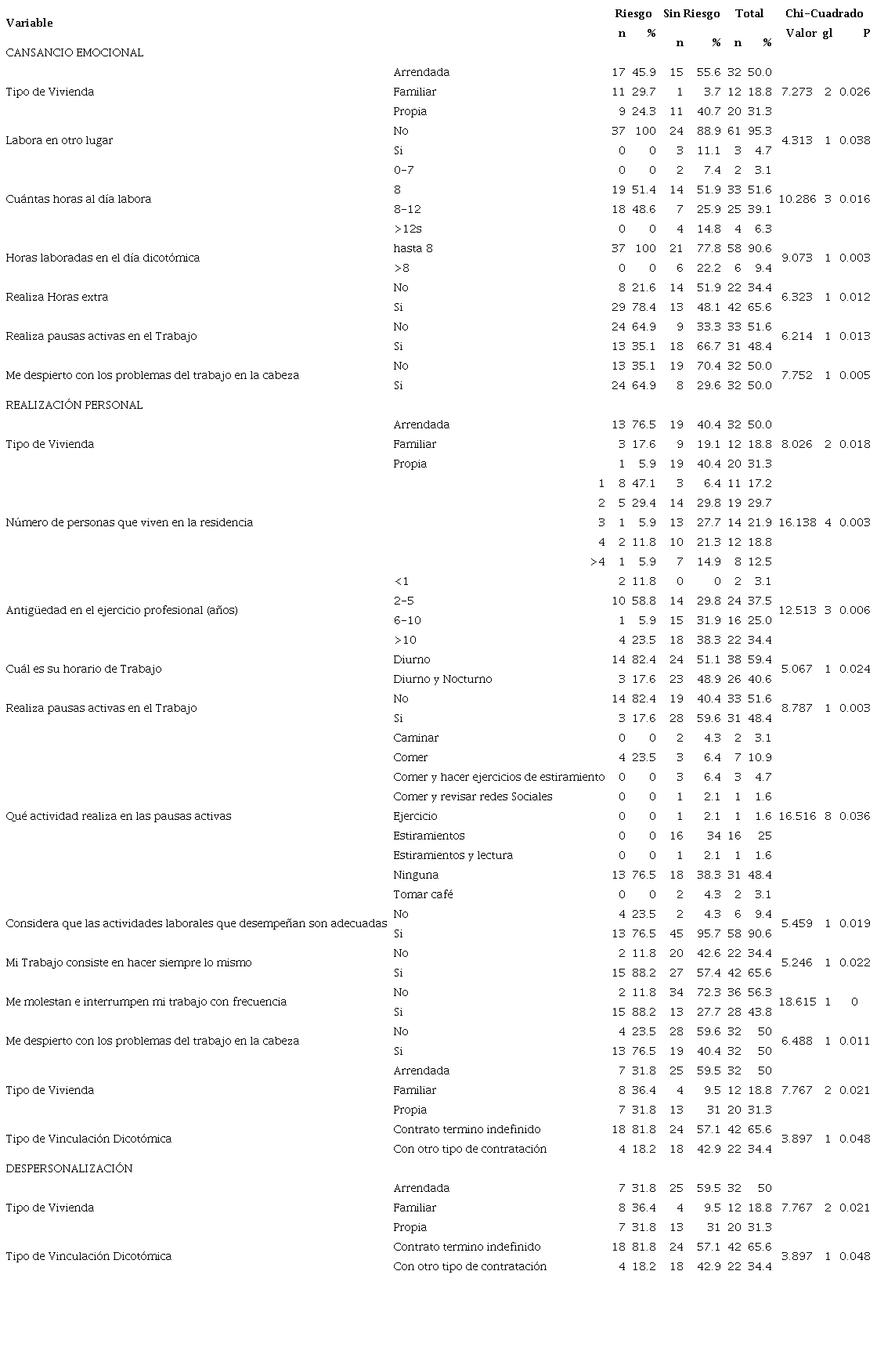 Con el “tipo de vivienda” se reafirmó como factor protector tener vivienda propia (P= 0.026). De igual manera, la variable “labora en otro lugar” mostró que trabajar en más de una entidad aumentaba el cansancio emocional (P= 0.038). Respecto a las horas de trabajo dedicadas se comprobó que entre más tiempo se laboraba (más de 8 horas) mayor era el cansancio emocional (P= 0.003). La anterior afirmación se apoyó también en la variable de “realiza horas extras” en donde se mostró que se presentaba más cansancio emocional en cuanto más horas extras realizara el colaborador (P= 0.012). Otra relación importante fue la identificada con las pausas activas: los colaboradores que no realizaban pausas activas presentaron un mayor cansancio emocional (P= 0.013), afirmación que en la literatura estudiada para este proyecto no se encontraron precedentes. Por último, quienes se despertaban con los problemas del trabajo en su cabeza, tenían mayor riesgo de presentar cansancio emocional (P= 0.005) (Tabla 3).