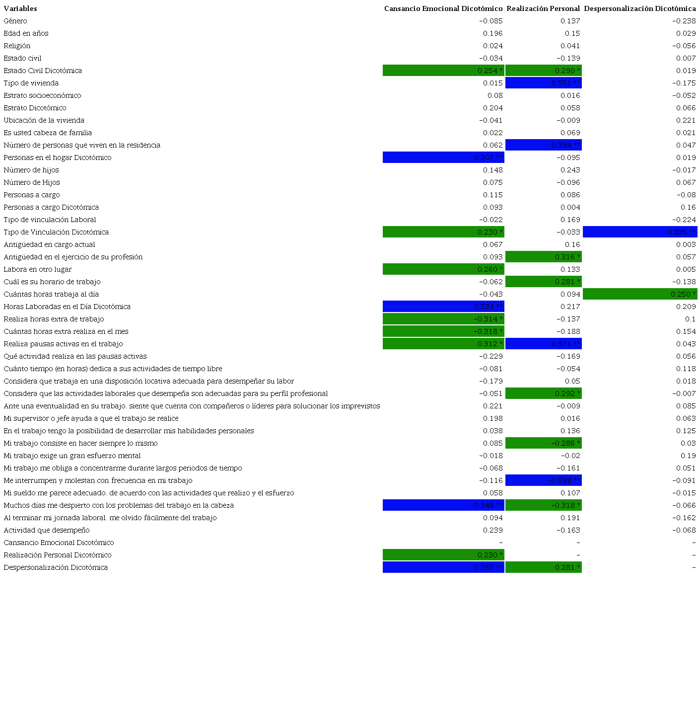 Se encontró que hay una relación estadísticamente significativa con tener doble vinculación laboral y el cansancio emocional, esto quiere decir que entre más trabajos tenga el profesional más cansado se siente, se evidencia más agotamiento emocional. Así mismo, el cansancio emocional se relaciona de manera directa con horas laboradas en el día, realización de horas extras en el trabajo y la cantidad de horas extras en el mes, evidenciando que el cansancio emocional aumenta entre más horas trabajan y esto puede ser un factor de riesgo para sufrir de Burnout (Tabla 4).