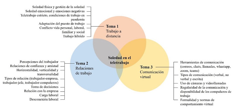 Conclusión: La experiencia de los participantes mostró que el teletrabajo causa soledad en los trabajadores, pero el trabajo híbrido y las relaciones entre los compañeros de trabajo que ocurren en ámbitos no laborales disminuyen la percepción de soledad, por lo que se hace necesario que las organizaciones con esta modalidad de trabajo tengan espacios de trabajo presenciales y mejoren sus estrategias de comunicación.