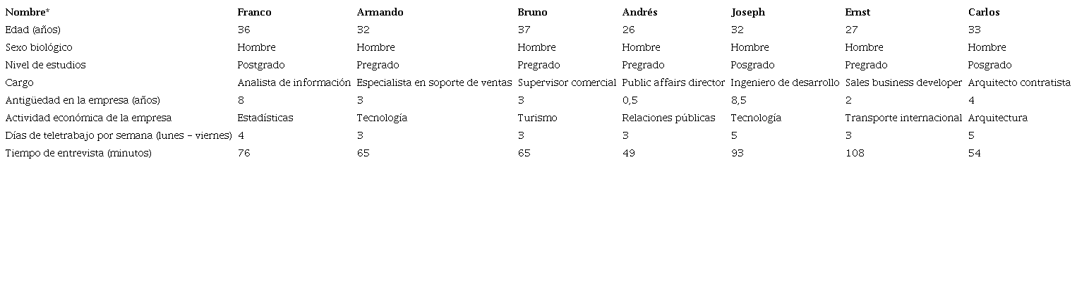 Los siete participantes en este estudio cualitativo cumplían los criterios de inclusión de la investigación. Las características sociodemográficas de los participantes se encuentran detalladas en la Tabla 1, se utilizaron pseudónimos en todos los casos para proteger la identidad. Todos los participantes del estudio se identifican como hombres cis, la edad promedio de la muestra fue 31.85 años y se encontraban empleados en empresas de servicios del sector público (n= 2) y privado. (5). La antigüedad promedio en la empresa fue 4.14 años, la modalidad de trabajo más frecuente al momento del estudio fue el trabajo híbrido (n= 5), y dos de los participantes ha desarrollado toda su vida laboral en teletrabajo, es decir, nunca han estado en trabajo presencial a tiempo completo.