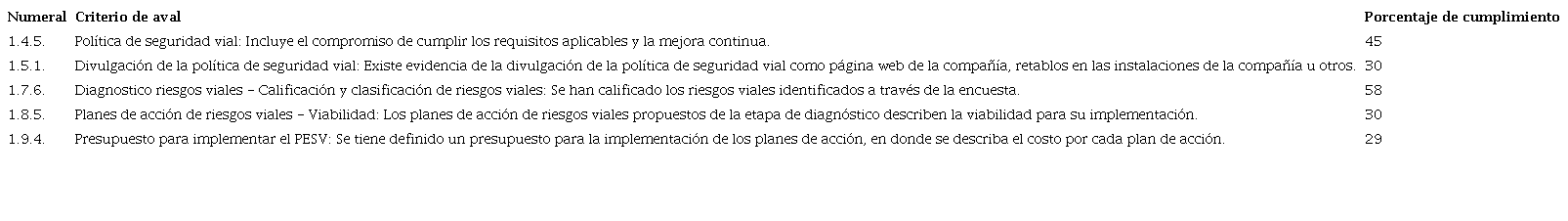 Resultados: Se permite evidenciar que los numerales 1.5.1; 1.8.5; y 1.9.4 con una distribución porcentual del 70% son los parámetros de evaluación más incumplidos en la línea de acción fortalecimiento de la gestión institucional. El pilar con mayor incumplimiento, en los numerales de evaluación del Plan Estratégico de Seguridad Vial (PESV) se da en infraestructura segura, con un promedio del 80% sobre todo los aspectos de rutas internas.