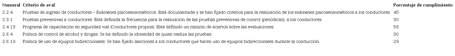 En el incumplimiento de los numerales 2.6.4 y 2.6.19, no solo se identificó la no definición de la idoneidad para quien realiza las pruebas de alcohol y drogas, y la falta de mecanismos de control para el uso de equipos bidireccionales durante la conducción, sino en general la tendencia de las organizaciones en cumplir con los requisitos a nivel normativo como definir políticas de regulación del comportamiento de sus trabajadores en este caso de conductores, sin definir de manera clara, cuáles serán las estrategias y mecanismos de control, que permitan medir y garantizar el cumplimiento de las directrices de obligatorio cumplimiento que han sido declaradas, y que de ser cumplidas contribuyen en la reducción de los riesgos derivados del transporte y la movilidad.