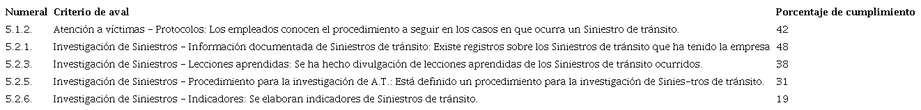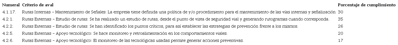 En evaluaciones individuales de empresas, se encontró que a pesar de tener un puntaje ponderado alto (87.2%) y que le permite recibir el aval de la autoridad de tránsito,25 se evidencia incumplimientos en todos los pilares. También en una empresa de transporte pesado tuvo un valor ponderado del 33.5%, donde los puntajes de los pilares encontrados van entre 0%-55%.26 Esto significa que aun no existe una conciencia empresarial para cumplir a cabalidad con el Plan estrategico de seguridad vial.