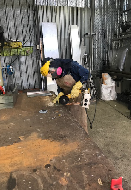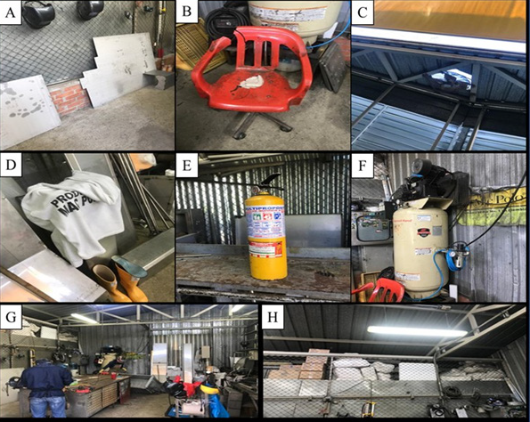 El personal de mantenimiento que realiza trabajos de soldadura se encuentra expuesto a riesgos directos e indirectos en el taller de soldadura entre los que se observa, riesgo locativo, mecánico, físico, químico, tecnológico, biomecánico, descritos en la siguiente figura, láminas de material de trabajo junto a la pared sin asegurar con riesgo de caída, silla hechiza en mal estado y adicionalmente con ruedas, dotación y ropa en el lugar de trabajo, extintor ubicado en el suelo, sin base ni señalización, bodega contigua al taller de soldadura donde se almacenan productos aseo como: jabones, desengrasantes para pisos, tarros plásticos, toallas de papel, cajas con papelería, costales con envases plásticos, deficiencia de orden y aseo en general sin adecuado almacenamiento de equipos, herramientas, materiales de trabajo, deficiente espacio de trabajo y zona de tránsito (Figura 1-A, B, D, E, G, H) riesgo de corte o heridas con láminas, golpes contusiones o aplastamientos con equipos y herramientas (Figura 1-A, G) exposición a altas temperaturas por deficiente ventilación al interior del taller y encerramiento en láminas de zinc, ruido constante por compresor de aire ubicado al interior del taller,(Figura 1-C, F, G) riesgo químico por la ausencia de campanas extractoras y deficiente sistema de extractores y/o ventilación de humos y vapores (Figura 1-C) Riesgo de incendio o explosión por almacenamiento de materiales combustibles alrededor, riesgo de explosión compresor de aire por sobrepresión (Figura 1-F) En relación con el riesgo biomecánico se registra inadecuado diseño de puesto de trabajo, el cual expone a las trabajadores a dolor cervical, en manos y miembros superiores, asociado a posturas y movimientos repetitivos (Figura 1G).