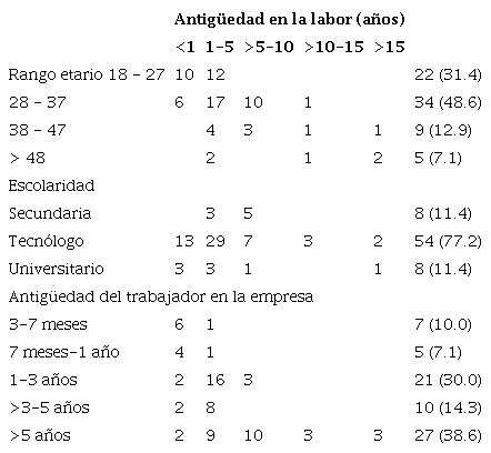 En relación a la caracterización sociodemográfica de los 70 participantes, todos pertenecían al género masculino, donde el 48.6% se encontraban entre 28 y 37 años, en su mayoría tecnólogos (77.1%), donde la experiencia laborando en la empresa, en el área de mantenimiento se encontró entre más de 1 año a más de 5 años (82.8%), en contraste la experiencia en este tipo de actividad correspondió a entre 1 a 5 años ( 50.0%), seguido por la categoría<1 año (22.9%) ( Tabla 1).