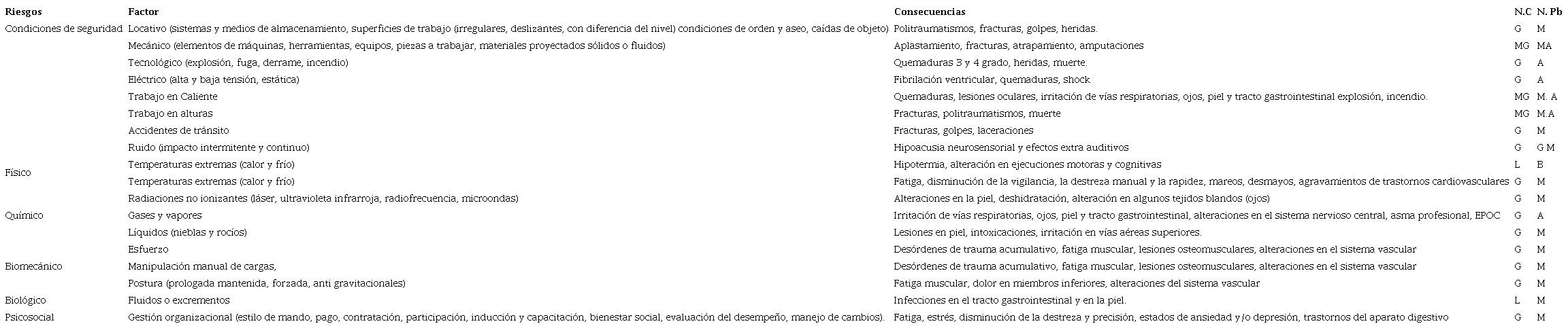 De acuerdo con los resultados obtenidos en el estudio, fue posible evidenciar la existencia de riesgos directos e indirectos, siendo uno de los más influentes el que ha sido clasificado como condiciones de seguridad, que abarca en sí, los peligros locativo, mecánico, tecnológico, eléctrico, trabajo en caliente, trabajo en alturas y accidentes de tránsito por circulación vehicular dentro de las instalaciones de la planta. En este sentido, las consecuencias posibles, de la afectación de estos riesgos incluyen desde laceraciones y heridas no mayores, hasta amputaciones, fracturas y muerte. Otros riesgos corresponden a la clasificación de físicos; abarcando condiciones de ruido, temperaturas extremas (calor y frío) y radiaciones no ionizantes, considerando que sus efectos pueden presentarse como hipoacusia, hipotermia, alteración de las ejecuciones motoras y cognitivas, y alteraciones en la piel, que pueden variar entre irritaciones leves y cáncer 16.
