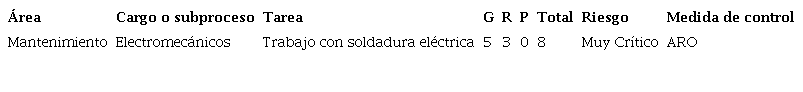 Entre las actividades de mantenimiento, la tarea con puntuación critica correspondió a soldadura con arco, esta actividad registró una puntuación de 8 según la NTC 4116 de 1997, por lo tanto, con la tarea se calificó como crítica, realizando el análisis de riesgo por oficio (ARO), indicando que el desarrollo de la tarea, se encuentra asociado a la existencia de riesgo de causar accidentes graves durante su ejecución. (Tabla 3)