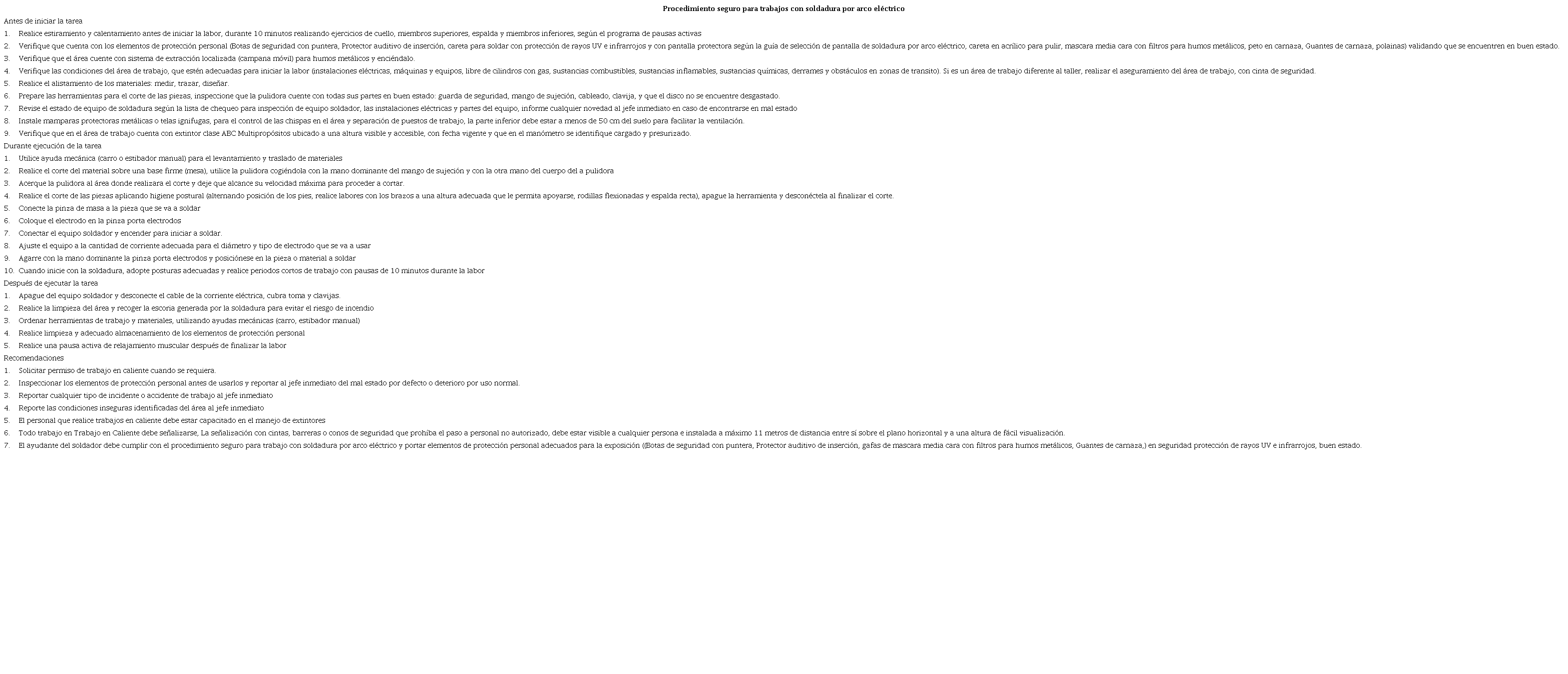 Posteriormente con la información identificada en el ARO se realiza el procedimiento seguro para trabajo con soldadura por arco eléctrico en el área de mantenimiento, especificando los pasos a ejecutar antes, durante y después de la tarea, de una forma segura y así estandarizar el proceso con el fin de que todos los colaboradores cumplan con las mismas normas de seguridad (Tabla 4).