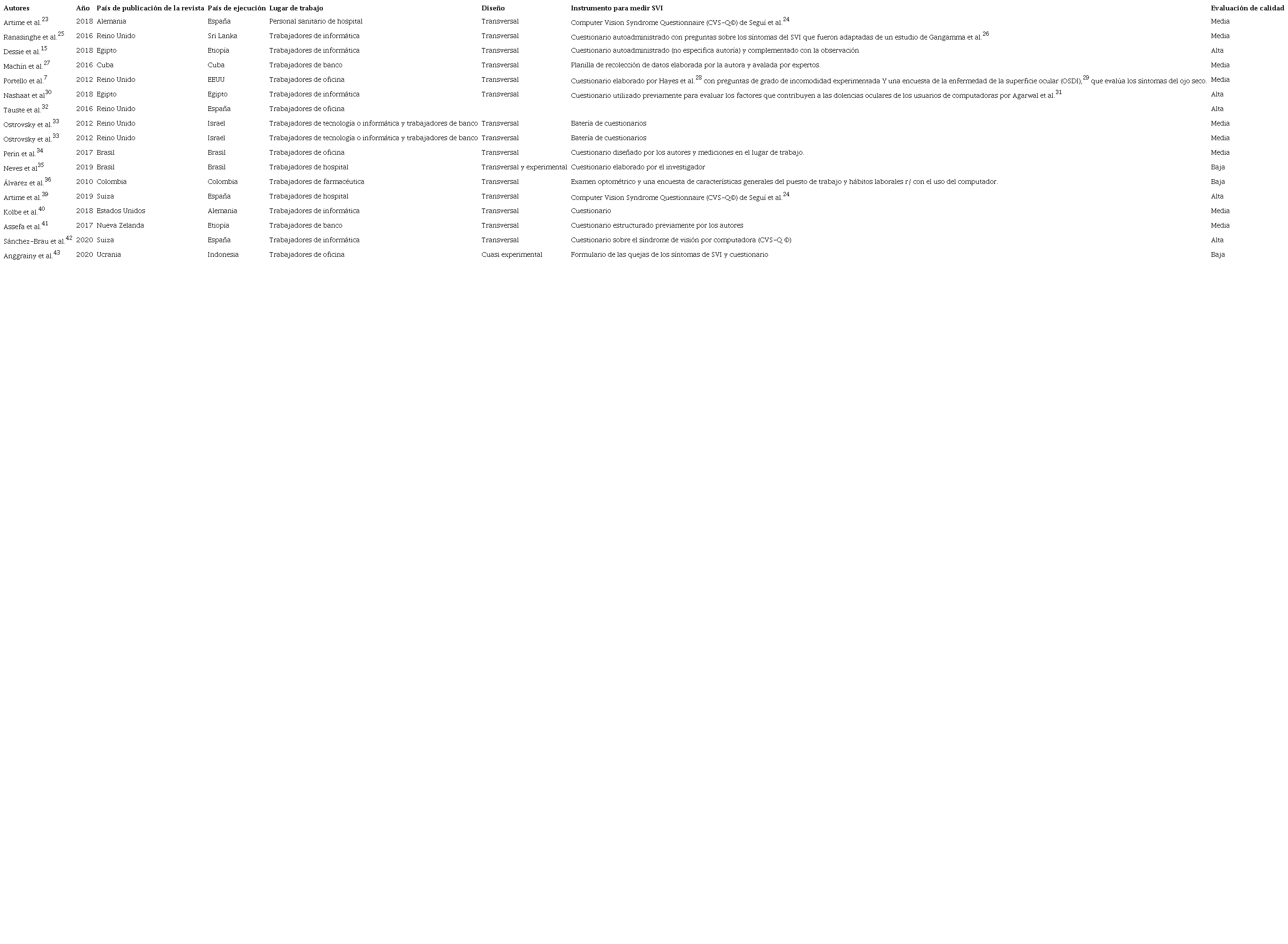 Finalmente, la extracción de la información de los artículos que cumplieron con el protocolo se organizó en una tabla de Excel© que contenía la siguiente información: título, autores, año de publicación, revista, país de publicación de la revista, país donde se realizó el estudio, lugar de trabajo de los participantes del estudio, diseño, instrumento para medir signos y síntomas relacionados con el SVI y evaluación de la calidad.