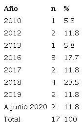 En la Tabla 2 se aprecia que el 76.5% (n= 13) de los estudios se publicaron del 2016 a junio del 2020 y el 2018 fue el año con mayor frecuencia de artículos publicados con 23.5% (n= 4). Con base en la frecuencia de estudios, desde el año 2016 se puso de manifiesto un sostenido número de publicaciones sobre SVI en población trabajadora adulta que utiliza el computador.
