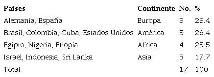 En relación con el país de publicación evidenciado en la Tabla 3, se encontró que la mayoría fue publicada en revistas del Reino Unido (23.5%, n= 4), y de acuerdo al país donde se realizó el estudio, los países con el mayor número de publicaciones fueron España con un 23,53% (n= 4), Etiopía y Brasil con el 11.8% cada uno (n= 2), Indonesia, Colombia, Cuba, Estados Unidos, Egipto, Alemania, Israel, Nigeria y Sri Lanka con el 5% para cada país (n= 1). De acuerdo con lo anterior y el protocolo de búsqueda, Europa fue el continente que presentó mayor frecuencia de publicaciones mientras que Oceanía no evidenció alguno.