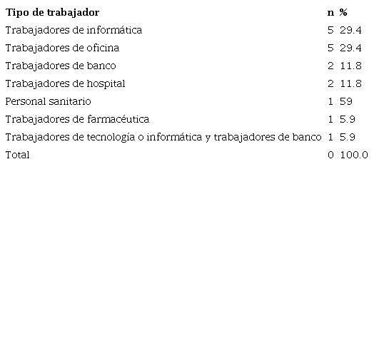 Por otra parte, en la Tabla 4 se evidencia que los trabajadores de oficina fueron los más utilizados por los autores Perin et al.34, Portello et al. 7, Tauste et al.32, Anggrainy et al. 43, Akinbinu y Mashalla,37 con 29.4% (n= 5), así como los trabajadores de informática manejados por Kolbe et al.40, Nashaat et al. 30, Sánchez- Brau et al.42, Dessie et al.15, y Ranasinghe et al.25, con 29.4% (n= 5).