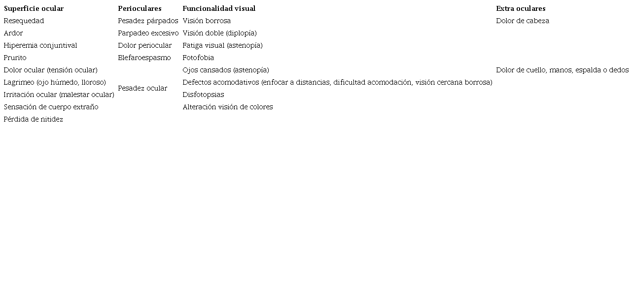 Los síntomas que constituyen el SVI pueden clasificarse ampliamente en oculares, visuales y extra oculares. La gravedad y el tipo específico de síntoma experimentado están relacionados con el tiempo de exposición al computador, la naturaleza de la tarea visual exigente, los factores ambientales en el puesto de trabajo y las habilidades visuales del individuo.44 En la Tabla 5 se muestra la clasificación de los síntomas informados por los trabajadores usuarios de los computadores en los artículos revisados.