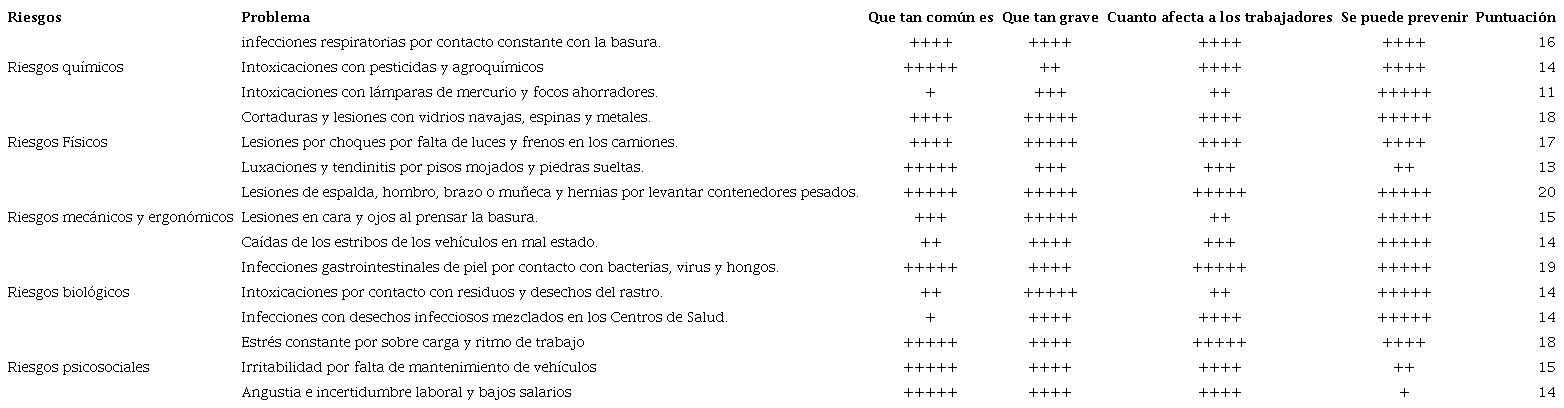 Mediante un proceso dialógico donde los trabajadores expresaron las vivencias y experiencias en torno a la exposición de riesgos, los trabajadores señalaron que el principal problema es estar en constante contacto con la basura, y que los usuarios mezclan basura común que se genera en los hogares, con residuos peligrosos. Revelan que la población (aunque está prohibido) con frecuencia mezcla en la basura común, envases vacíos de agroquímicos, a pesar de que hay contenedores especiales para este fin, además de otros residuos como latas de pintura, materiales inflamables y otros químicos peligrosos. De estos riesgos la puntuación más alta (16 +) la obtuvo las infecciones respiratorias por contacto constante con la basura.