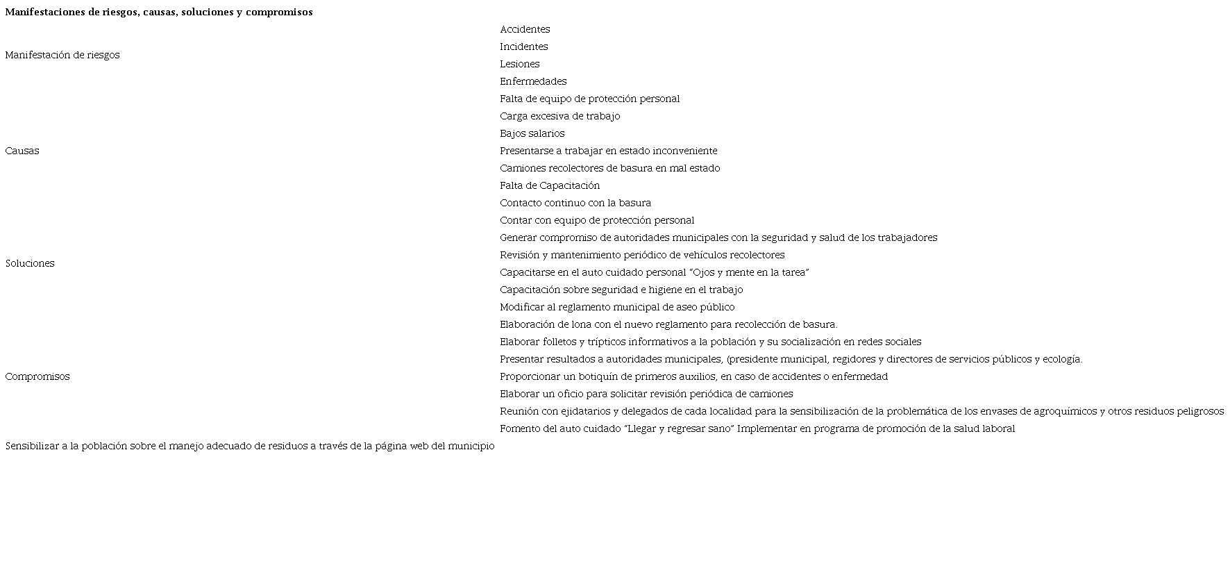 Objective: To identify risks and working conditions that limit the safety and health of garbage collectors through a participatory diagnosis in a municipality of the Valleys Region of the state of Jalisco.