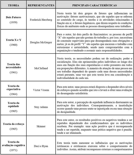 Neste tópico sistematizamos os achados da pesquisa considerando as decorrências da Teoria das Necessidades Humanas de Maslow, sua influência nas demais teorias motivacionais. Nesse sentido, o Quadro3 traz uma síntese das principais teorias motivacionais identificadas nos artigos que compuseram o corpus do nosso estudo