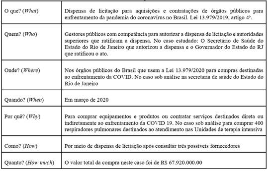 No presente trabalho, a primeira etapa trata-se do conhecimento do problema, para compreensão da dispensa de licitação em razão da COVID-19. Para isso foi utilizada a ferramenta 5W2H.