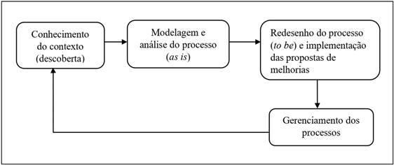 Pereira et al. (2015, p. 101) definem metodologia de gestão por processos como “[...] um conjunto de etapas para aplicação de conceitos e melhores práticas para gestão por processos”. Os autores propõem uma metodologia de gestão por processos, cujas etapas são representadas na figura 1 a seguir.
