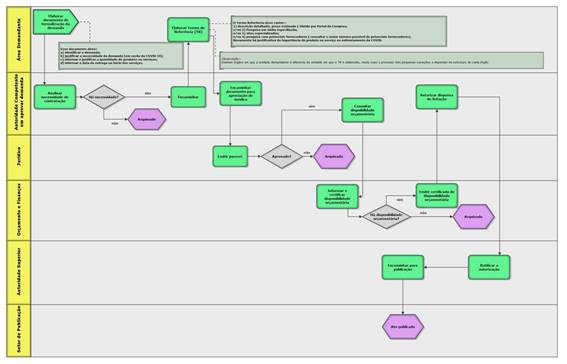 O processo da dispensa de licitação para enfrentamento da COVID-19 (Figura 2) inicia na área demandante. Na maioria das entidades públicas, o departamento de compras recebe as necessidades e prepara os documentos a serem enviados à autoridade competente. Portanto, a primeira via é onde o “Pedido de Solicitação” é preparado. É encaminhado para a segunda via na qual a autoridade competente analisa a necessidade da demanda. Havendo necessidade de demanda, o processo segue novamente para a primeira via ou para o departamento de compras ou departamento específico (unidade requisitante) para a elaboração do Termo de Referência. Quando a autoridade recebe o Termo de Referência, este é encaminhado ao departamento jurídico (terceira via) para análise, para que, em termos legais, seja emitido parecer sobre a adequação às regras e princípios de licitação.