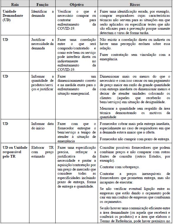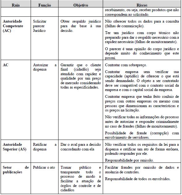 Assim, este artigo aponta gargalos nos processos de dispensa de licitação fundados na Lei 13.979/2020 (BRASIL, 2020) que somente poderiam ser evitados se os gestores fizessem uma adequada gestão de riscos. Embora a lei somente obrigasse a realização do Relatório de Riscos no momento posterior à contratação, seria fundamental que os gestores controlassem esses riscos em concomitância com cada entrada e saída do processo de dispensa de licitação. Além disso, as ferramentas de gestão por processos e de gestão de riscos podem ser grandes aliadas na capacitação de gestores e de todos os servidores envolvidos com processos de dispensa de licitação.