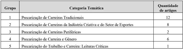 Ao finalizar-se a leitura dos artigos, estes foram agrupados em cinco categorias. As três primeiras reunem artigos que abordam os efeitos da precarização do trabalho em carreiras e/ou atividades profissionais específicas: 1) Precarização de Carreiras Tradicionais; 2) Precarização de Carreiras da Indústria Criativa e do Setor de Esportes; 3) Precarização de Carreiras Periféricas. A quarta categoria reúne os artigos que abordam a precarização nas carreiras de mulheres e, o quinto, apresenta um artigo que trata a relação entre a precarização do trabalho e carreira de forma crítica (Quadro 4).