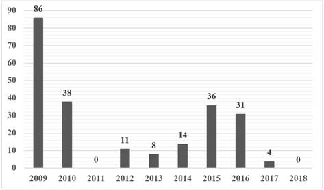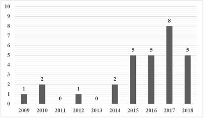 No escopo de análise observou-se que a publicação do primeiro artigo ocorreu no ano de 2009, quando apareceu apenas uma publicação; no ano seguinte foram publicados três artigos, mas, em 2011, nenhum artigo foi publicado. No período de 2009 a 2014 a quantidade de publicações manteve-se baixa, porém verificou-se um aumento de publicações após 2015, chegando-se a oito publicações em 2017 e, até de julho de 2018, já havia cinco publicações, podendo-se observar uma tendência de aumento nas publicações e, possivelmente, no interesse pela temática, conforme se observa na Figura 1.