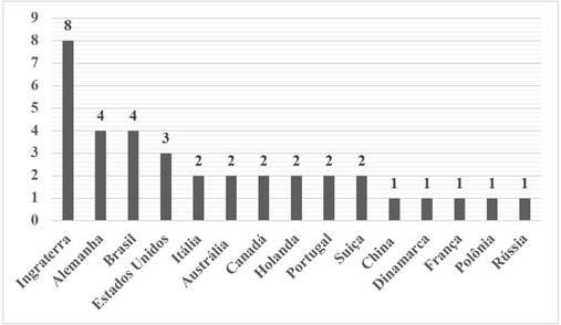 A Figura 3 apresenta o gráfico com o conjunto de países onde as pesquisas abordaram os fenômenos analisados, recebendo maior destaque a Inglaterra, com nove estudos, seguida da Alemanha e do Brasil, com quatro, e, na sequência, os Estados Unidos e a Itália, com três publicações. O somatório das publicações nesta figura é maior que o quantitativo de artigos, pois alguns estudos realizaram pesquisas em mais de um país.