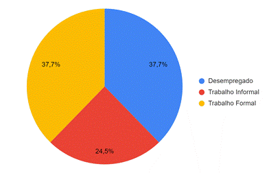 A pesquisa realizada mostrou que apenas 37,7% dos indivíduos estão trabalhando sob o regime CLT, 24,5% trabalham no mercado informal (autônomo, PJ, terceirizado, entre outros) e 37,7% estão desempregados. Os resultados são mostrados no Gráfico 1: