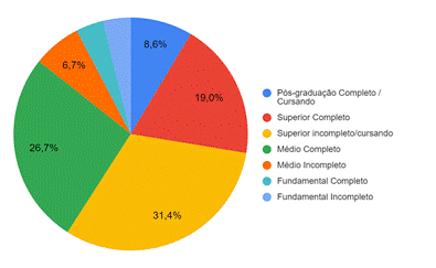 Tratando-se da escolaridade, 85,7% da amostra possuem ensino médio completo ou um grau superior, conforme Gráfico 2. Além do grau de escolaridade, verificou-se que 58,5% dos que contribuíram com a pesquisa possuem curso de capacitação profissional. Normalmente, esses cursos têm como fundamento a preparação do cidadão para ingressar no mercado de trabalho em uma empresa ou área com a qual a pessoa se identifica.