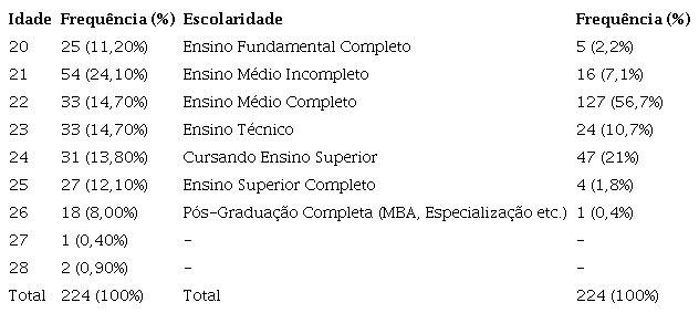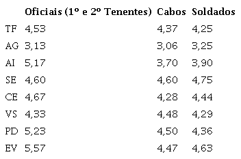 Como é sabido, os militares temporários ingressam na instituição por meio do serviço militar obrigatório e não podem ficar mais do que 8 anos na instituição. Por esse motivo a idade dos participantes não ultrapassou a faixa etária de 28 anos. Vale ainda destacar que esses militares temporários possuem 2 anos ou mais na instituição, ou seja, eles já são militares que passaram pelo período obrigatório e continuam na instituição por decisão própria.