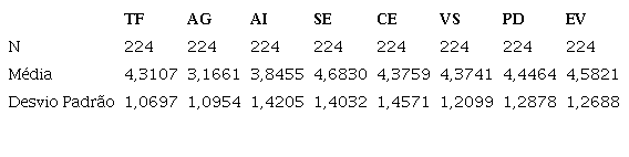 Com o auxílio do SPSS, foram realizadas estatísticas descritivas com o objetivo de identificar qual âncora de carreira dos 224 militares temporários obteve a média mais alta, conforme Tabela 2.