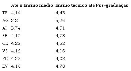 Para melhor explorar os resultados imediatamente supracitados, optou-se por apresentar a média das âncoras de carreira dos militares temporários por posto/graduação (PG) e escolaridade, conforme Tabelas 3 e 4.