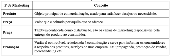 De acordo com Cobra (2015), os 4 Ps de Marketing, também chamados de Mix de Marketing ou Composto de Marketing, são os quatro pilares essenciais de qualquer estratégia de marketing e, quando estão em equilíbrio, tendem a influenciar e conquistar o público. Primeiramente, para entregar sua proposição de valor, a empresa deve criar uma oferta ao mercado (produto ou serviço) que satisfaça necessidades, depois decidir quanto cobrará pela oferta (preço) e como disponibilizará a oferta para os clientes-alvo (praça). E por fim, deve comunicar a oferta aos clientes-alvo e persuadi-los de seus méritos (promoção).