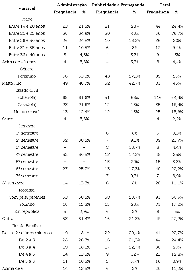 No tocante à moradia, a maioria dos respondentes, 91 (50,6%) estudantes, afirmaram morar com os pais/parentes, 53 (50,5%) de Administração e 38 (50,7%) de Publicidade e Propaganda; 5% dos entrevistados afirmaram que moravam em república, o que equivale a 3 (2,9%) alunos de Administração e 6 (8%) de Publicidade e Propaganda. Em relação à renda mensal, 24,4% afirmaram que têm renda de dois a três salários, sendo 28 (26,7%) respondentes de Administração e 16 (21,3%) do curso de Publicidade e Propaganda. Com base na classificação de classe social do IBGE, a grande maioria dos participantes da pesquisa são de classe D e E. No geral, o perfil socioeconômico e demográfico dos dois cursos é similar.