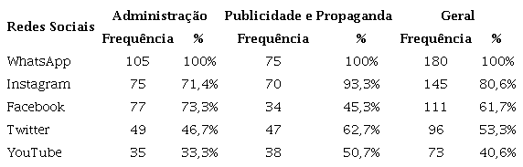 Observa-se na Tabela 2 que as Redes Sociais que os estudantes mais possuem conta são WhatsApp (100%), seguido de Instagram (80,6%) e Facebook (61,7%). Em relação ao Instagram, 75 (71,4%) dos estudantes de Administração acessam, e 70 (93,3%) de Publicidade e Propaganda; já o Facebook, são 77 (73,3%) dos alunos de Administração e 34 (45,3%) de Publicidade e Propaganda. No estudo de Andrade-Matos e Perinotto (2020) sobre a influência das mídias sociais na decisão de compra de serviços de hospedagens, no qual 44% dos respondentes eram jovens (até 25 anos), 97,3% afirmaram que usam algum tipo de mídia social digital, sendo o WhatsApp o mais usado (92,7% dos respondentes), corroborando com os achados dessa pesquisa.