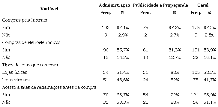 É predominante o número de respondentes que acessam sites de reclamações antes de realizar uma compra, 68,9%. Desse total, dos estudantes de Administração, 102 (97,1%) afirmaram que já realizaram compras pela Internet, entretanto, um pouco mais da metade, 51,4%, prefere realizar compras em lojas físicas. 90 (85,7%) respondentes afirmaram já ter comprado algum eletroeletrônico, e 70 (66,7%) costumam acessar sites de reclamações antes de efetuar uma compra. Já em relação ao curso de Publicidade e Propaganda, a maioria dos respondentes, 73 (97,3%), afirmaram já ter realizado compras pela Internet; e 81,3% já compraram eletroeletrônicos. Porém, 51 (68%) respondentes preferem realizar a compra em lojas físicas. Também é predominante, no curso de Publicidade e Propaganda, o número de respondentes que acessam sites de reclamações antes de realizar uma compra, 72%.