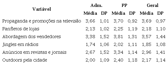 Em relação às variáveis que receberam as menores médias de concordância, estão “Jingles em rádios” (1,74) e “Outdoors pela cidade” (2,00) para os estudantes de Administração; entretanto, para os respondentes do curso de Publicidade e Propaganda, as variáveis com menor adesão foram “Jingles em rádios” e “Panfletos de lojas”, com médias 2,02 e 2,25, respectivamente. Em análise geral, “Jingles em rádios” e “Outdoors pela cidade” foram as variáveis que obtiveram as menores médias de concordância: 1,85 e 2,17, nessa ordem.