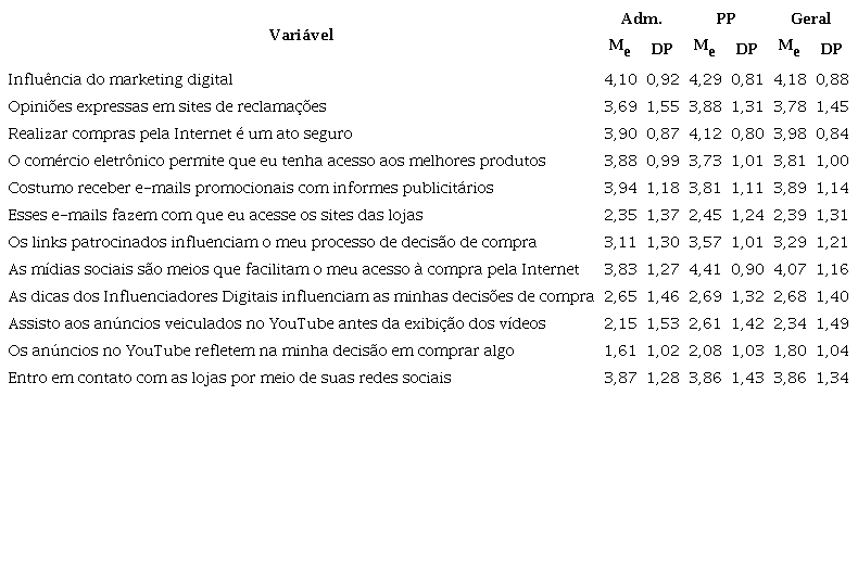 No que se refere ao marketing digital, as variáveis “Influência do marketing digital” e “As mídias sociais são meios que facilitam o meu acesso à compra pela Internet” foram as que obtiveram resultados mais significativos, no aspecto geral. Isso evidencia que é cada vez maior a influência que esta forma de comunicação tem sobre os consumidores, sobretudo quando é realizada por mídias sociais.