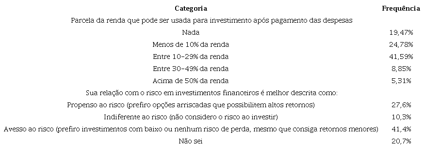 Uma outra característica interessante encontrada na pesquisa é que 66,37% afirmam ter disponíveis após o pagamento de despesas, ou seja, potencial recurso para investir até 29% da renda. Especificamente, o segmento com maior frequência é disponibilidade de renda entre 10-29%, o que contradiz o estudo de Paiva, Silva, Souza, Novôa e Pereira (2020), que encontrou a renda média de 10% para investimentos.