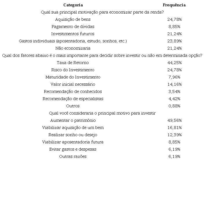 Os resultados do trabalho aprofundam e expandem as pesquisas que investigam o perfil de investidores. Houve resultados convergentes em diversos pontos com a literatura prévia, como a predominância do perfil conservador e com preferência pela poupança, além de convergir com estudos que apontam o percentual médio disponível para investimento, com predominância na faixa de 10-29%. Porém, foram encontradas divergências em relação à finalidade do investimento, que geralmente é vista como destinada à segurança financeira, e os dados da pesquisa atual apresentam uma predominância pelo aumento do patrimônio seguido da aquisição de bens.