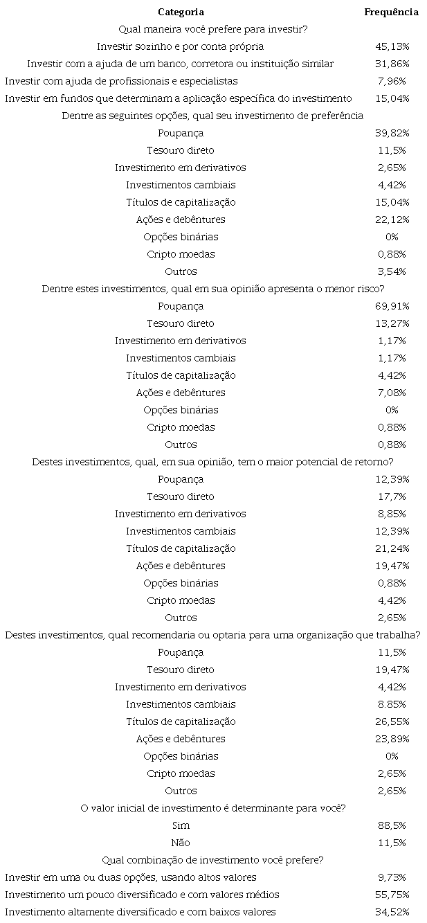A tabela abaixo apresenta resultados sobre as preferências de investimento na percepção dos participantes, em relação à fonte do recurso para investimento (próprio ou de terceiros), tipo de investimento, busca de auxílio para investir, quais investimentos apresentam menor risco e maior retorno possível.